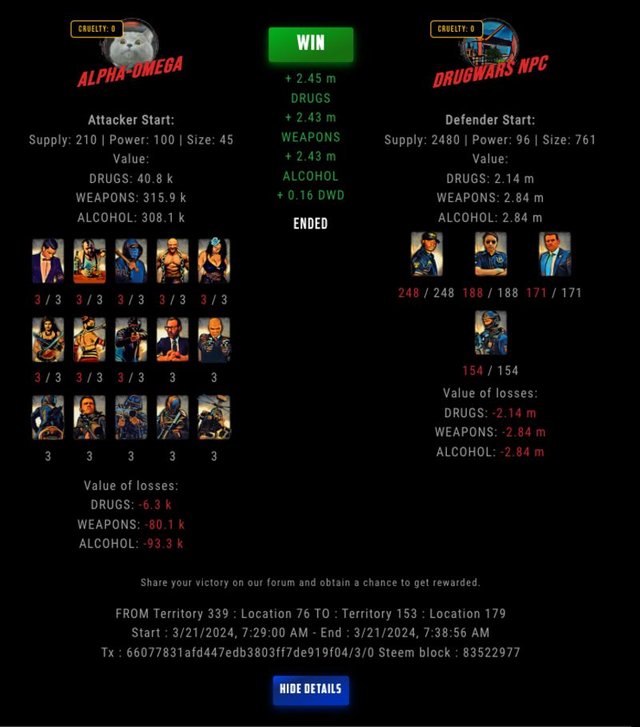 Check my latest fight ! alpha-omega vs The Govermentalpha-omega (71)in DrugWars • 2 years ago #drugwars-fight #gaming #fight #dw