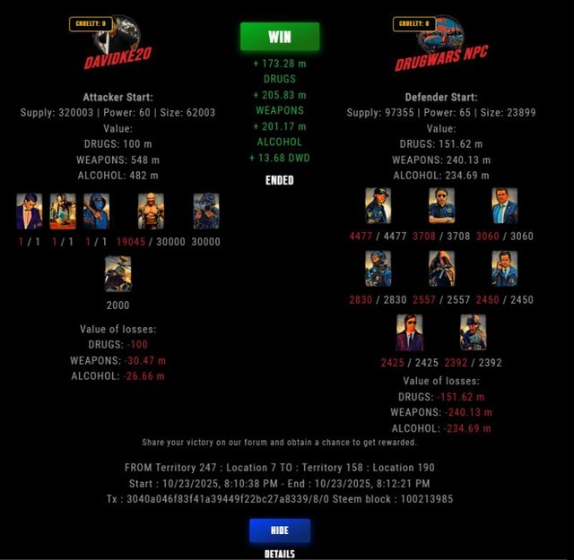 Check my latest fight ! davidke20 vs The Govermentdavidke20 (74)in DrugWars • 13 days ago #drugwars-fight #gaming #fight #dw