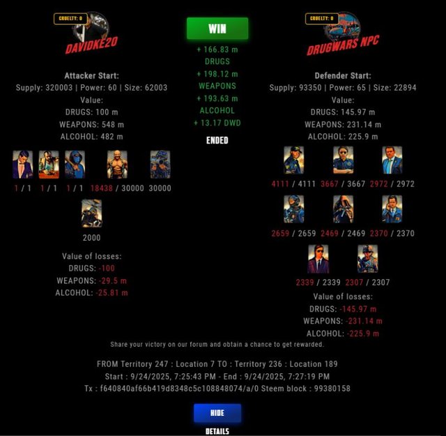Check my latest fight ! davidke20 vs The Govermentdavidke20 (74)in DrugWars • 18 days ago #drugwars-fight #gaming #fight #dw