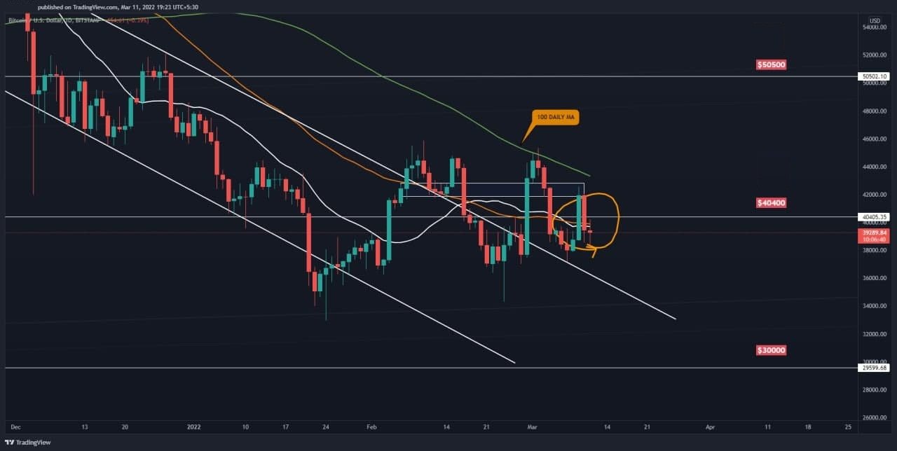 Bitcoin 차트는 12H 시간 프레임에서 저녁 별 약세 패턴을 묘사했습니다. 비트코인은 이 패턴을 무효화하기 위해 41,200 이상으로 양초를 마감해야 했습니다. 그렇지 않으면 비트코인 가격이 더 많이 폭락했을 것입니다.