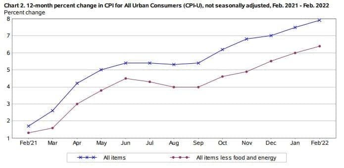 노동부에 따르면 인플레이션은 전년 대비 7.9% 증가했습니다. 1981년 7월 이후 최대 상승폭.