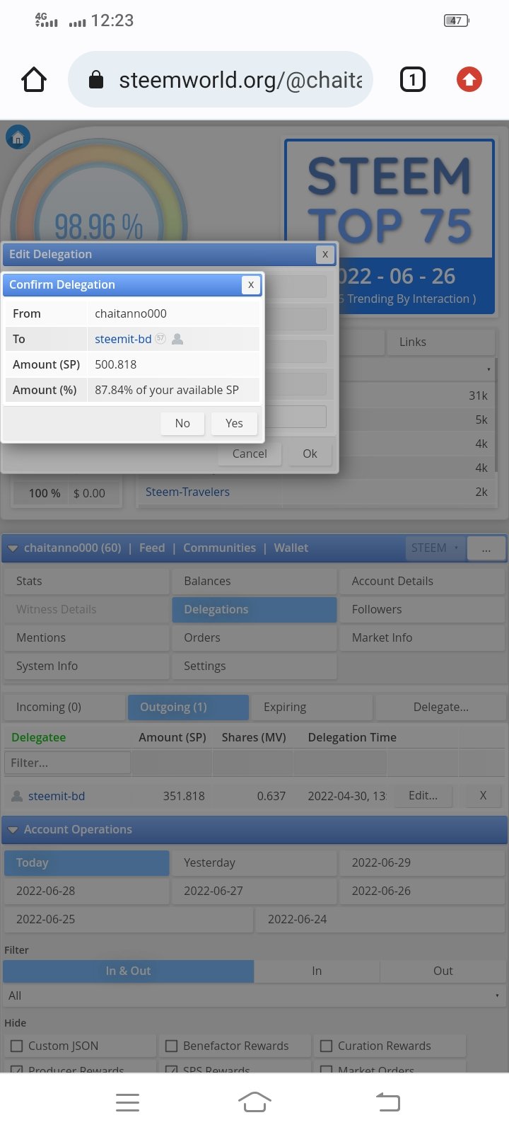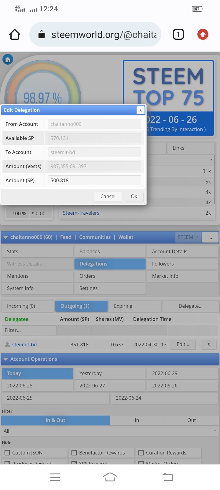 ডেলিগেশন কেনো করবও। আমরা জানি যে কমিউনিটিতে কাজ করতে হলে কমিউনিটির নিয়ম কানুন মেনে চলতে হয়। আমরা যদি কমিউনিটির পাশে থাকতে চাই তাহলে আমাদের কমিউনিটির শক্তি বৃদ্ধি করতে হবে। আর এই কমিউনিটির শক্তি বৃদ্ধি করতে হলে আমাদের বেশি বেশি করে ডেলিগেশন করতে হবে। আমরা যদি এই কমিউনিটিকে বেশি করে শক্তি শালি করতে চাই তাহলে আমাদের সবাইকে বেশি করে শক্তি বৃদ্ধির জন্য ডেলিগেশন করতে হবে। আর এই কমিউনিটির যদি শক্তি বৃদ্ধি না করি তাহলে কমিউনিটি থেকে আমরা কোন ভালো ফল পাব না। আর সকলের উচিত যে কমিউনিটি শক্তি বৃদ্ধি জন্য আমাদের সকলকে বেশি বেশি করে ডেলিগেশন করতে হবে। যেমন উদাহরন সরূপ বলা যায় যে যদি মানুষ খাবার না খায় তাহলে শক্তি হয় না তেমনি করে ডেলিগেশন না করলে কমিউনিটি শক্তি বৃদ্ধি হয় না। আর সেই জন্য আমি সকল কে বলতে চাই যে কমিউনিটি শক্তি বৃদ্ধি জন্য সবাই বেশি বেশি ডেলিগেশন করবেন। তাই আমি আমার ডেলিগেশন কিছু স্ক্রিনশীট আপনাদের সাথে শেয়ার করবো।তো চলুন বন্ধুরা শুরু করা যাক