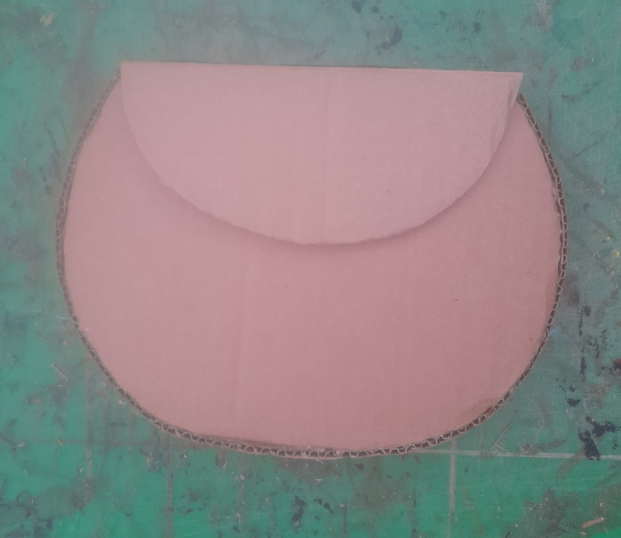 I draw the front view of the bag on a carton. The opening of the bag is straight and measures 20cm and the bottom of the bag is circular. After the drawing of the front view on a carton, I cut it out using scissors and a paper cutter.