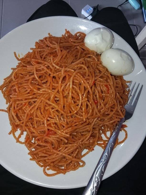 When I got home, Mum and the rest of the family were back home. I rushed to the bathroom and then freshened up. Then I proceeded to the kitchen to prepare dinner from the things I bought from the market. This time around, I prepared spaghetti for dinner. Here is a photo of the meal I prepared.