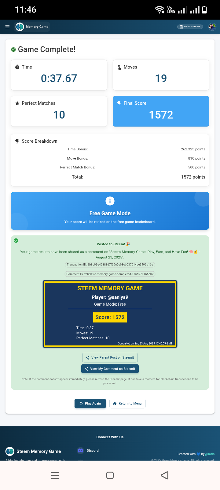 Now you can see your final score shown below which is automatically shared on Steemit. You can replay this game if you wish. You can play this free option as many times as you want. This memory game is the best way to share your intelligence. You can catch how effective and how fast your brain works.