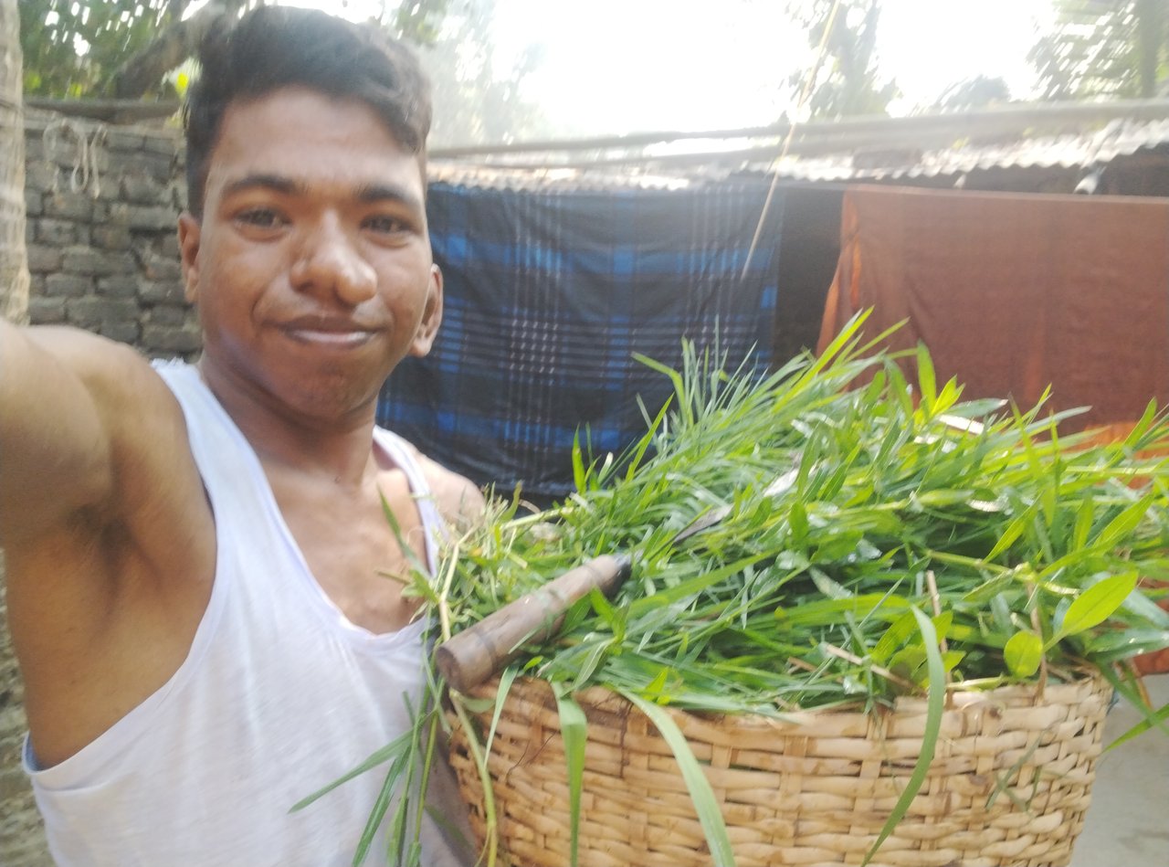 I love animals so I should take good care of them. And I want to say one more thing. I have a baby goat. I woke up early this morning and then I washed my face and had breakfast. I went to get grass for the cows and goats. Feeding them grass has many benefits for their body. Also, this goat's baby thinks very well. He will be able to drink milk from his mother. Earlier I gave grass to the cow. Then I went to Dupchachia town to buy husks.