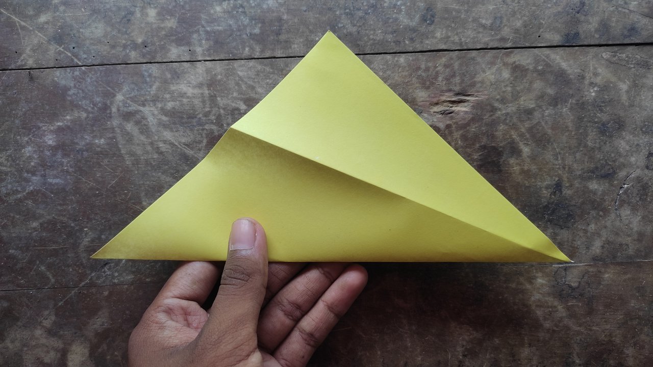 Pada langkah ini saya memilih beberapa warna seperti merah, kuning, biru, orange Dan ungu. Namun pada akhirnya saya hanya menggunakan 2 warna untuk membuat ikannya yaitu warna merah dan kuning saja. Untuk bagian badan ikannya saya menggunakan warna kuning kemudian melipatnya hingga mirip dengan salah satu jenis layangan. Kemudian kita harus membukakan kembali hingga terbentuk seperti segitiga dilanjutkan dengan memotong bagian bawahnya secara vertikal dan juga memotong bagian depan nya untuk menghilangkan bentuk lancipnya karena akan digunakan sebagai mulut nantinya.