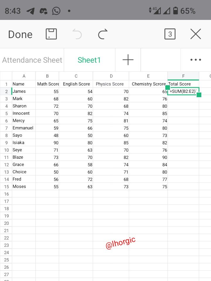 We would have to Introduce the Sum Function to give us the total score for each student in their various subject.