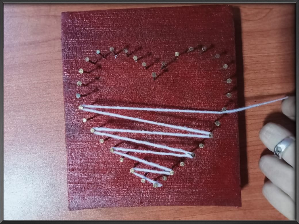 - Then I took a slightly stronger wool yarn. The wool thread was tied well in the nail made in the shape of a heart.