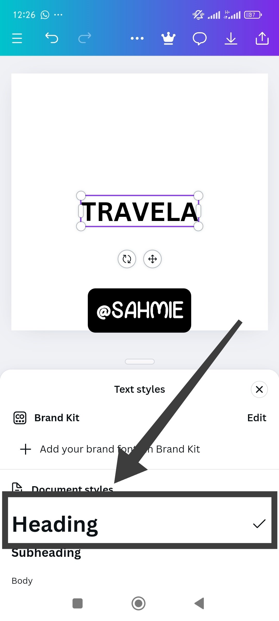 On the space provided, I entered the brand name, also made sure it was heading by clicking on "Head". Next task was looking for the right font to match the idea, which I kept searching until I arrived at a font named "Celandine" which I felt was good for the brand, so I put it to use and adjust the size of the logo.