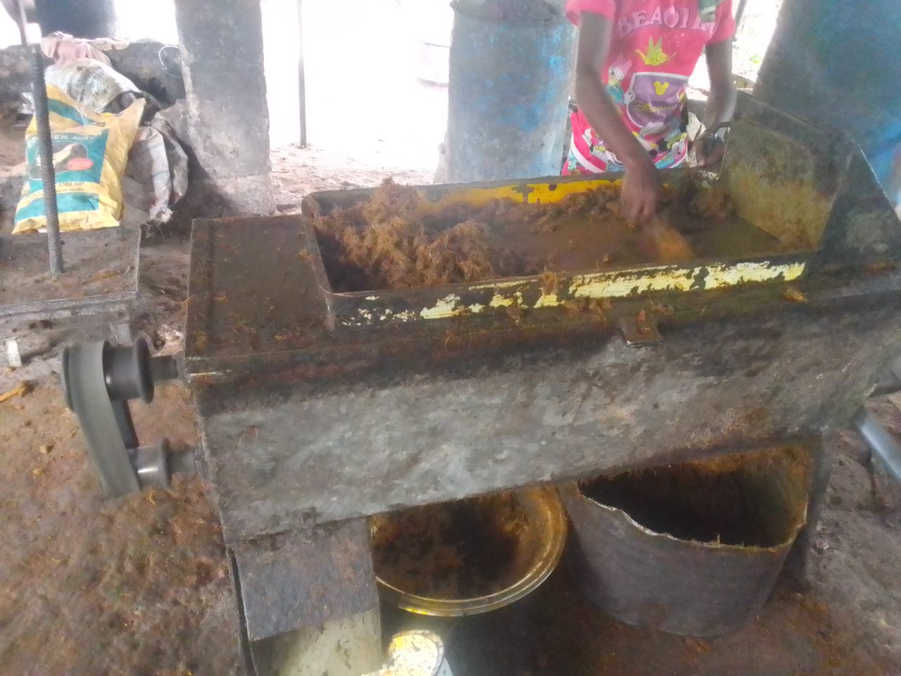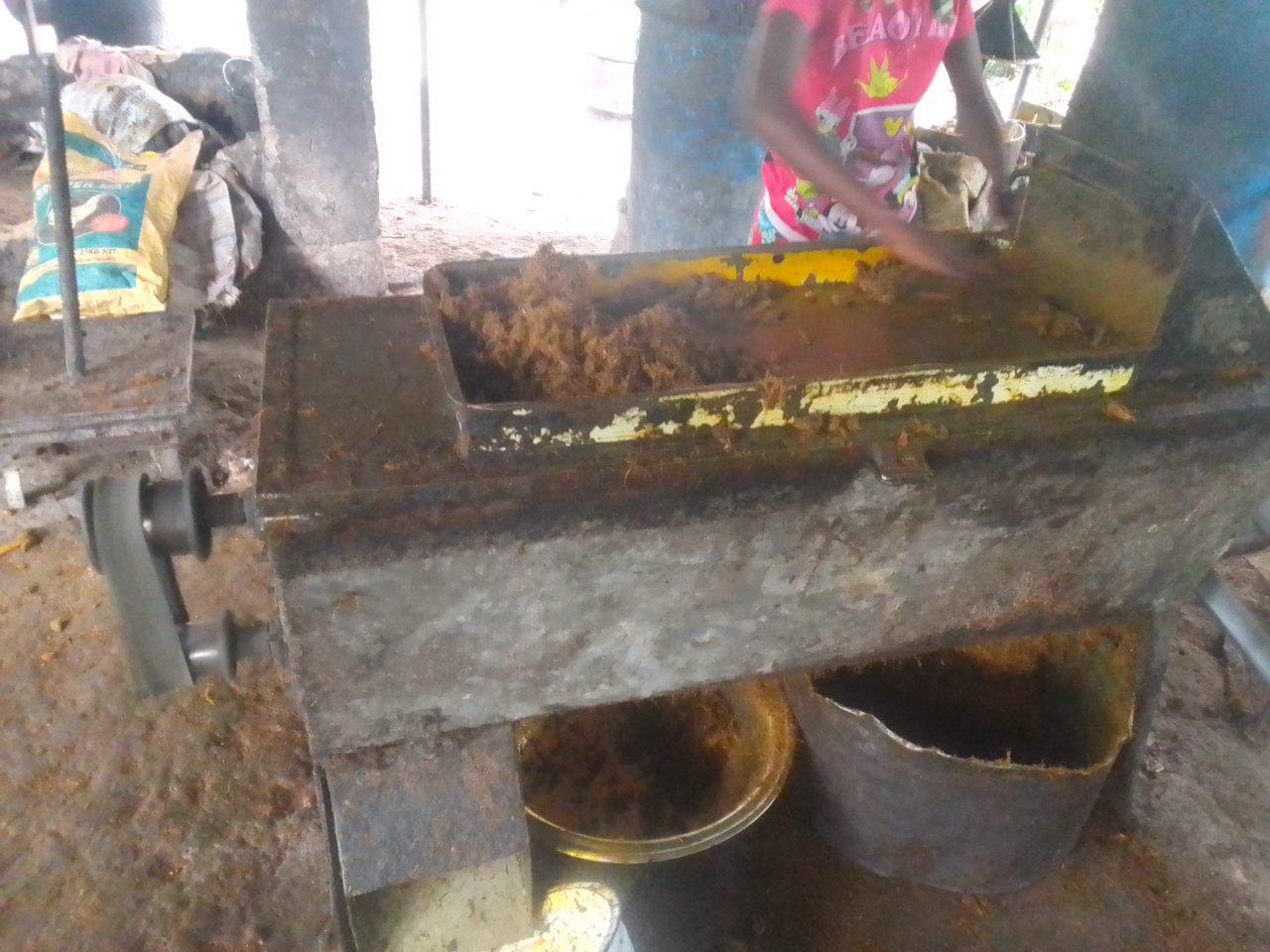 After being smash with the smashing engine we take it to the smashed palm fruits which now turned to palm fruits chaff to the squeezer after filled the chaff into the squeezer the handle was ready fix so I now start turning the handle to bring out palm oil from the basket and down to the gutter before reach the basin.