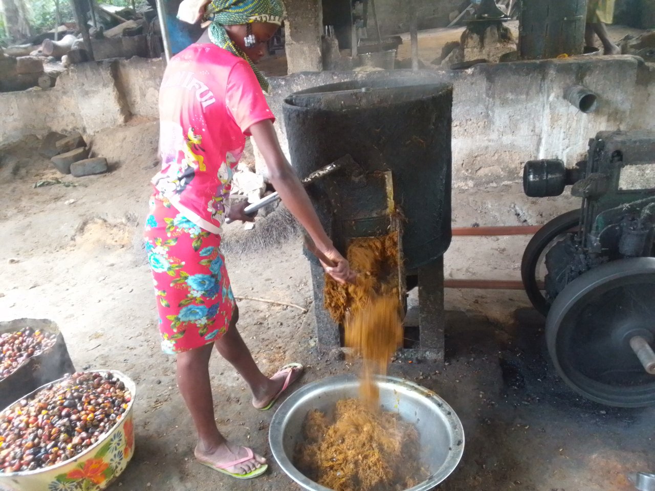 After the palm fruits chaff was been selected we take it to the squeezer the second time to squeeze out the oil which was the last step in palm oil production.