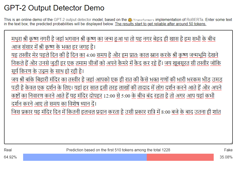 всё очень просто проверяется и объясняется. На скрине проверка моего текста, который был написан очень быстро по ходу создания поста. Разумеется, я не использовала никаких посторонних интеллектов при написании на русском языке. Но для публикации я сделала автоперевод на английский и он меня устроил без редактирования. Сейчас я этот текст загрузила в https://openai-openai-detector.hf.space/