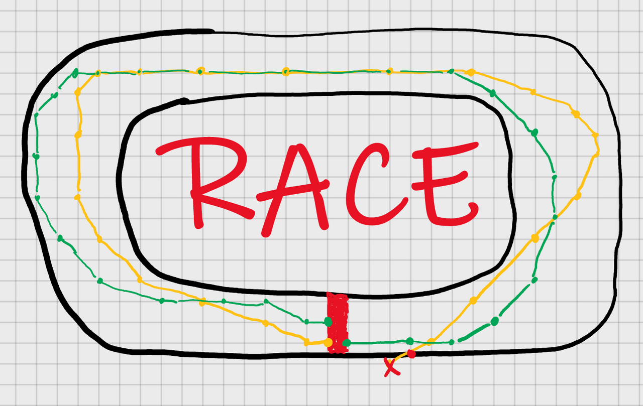 Размещаем старт/(он же финиш) и гонщиков на старте. (у меня оранжевый и зелёный)