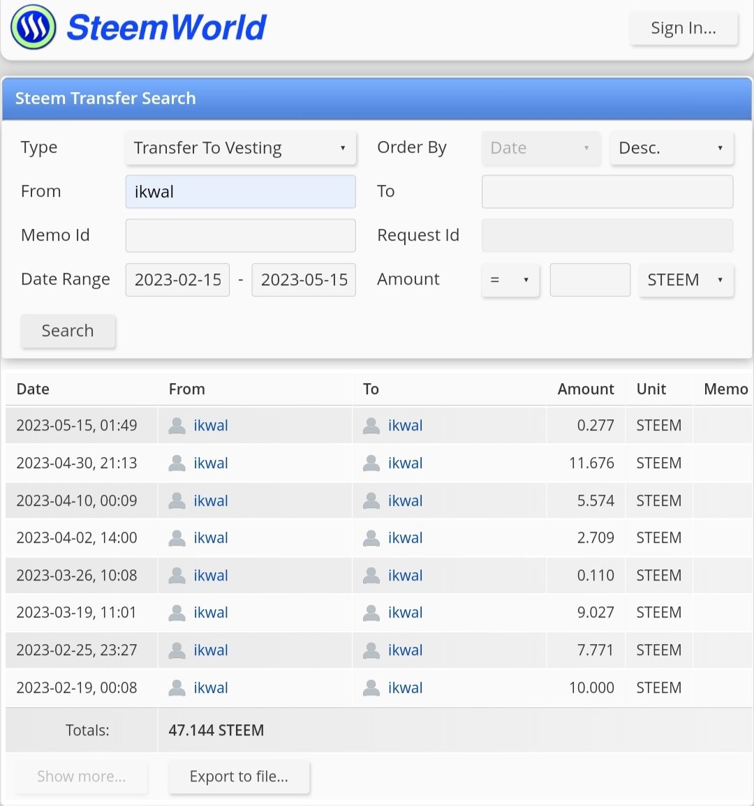 Even though the amount of steem that I turn on is not much, I will still consistently do power ups to maintain my account's position in club100. During the last three months, from the 15 date of February to the 15 date of May, I have powered up 47,144 steem.