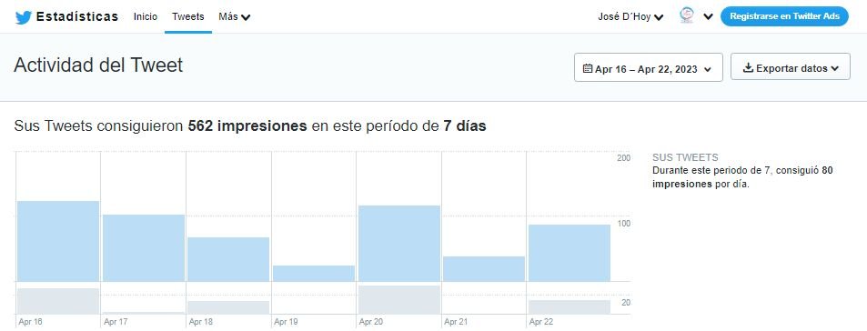 The Twitter Analytics tool, allows you to review the behavior of the publications, I present a graphic summary with the results for the week of April 16 to 23.