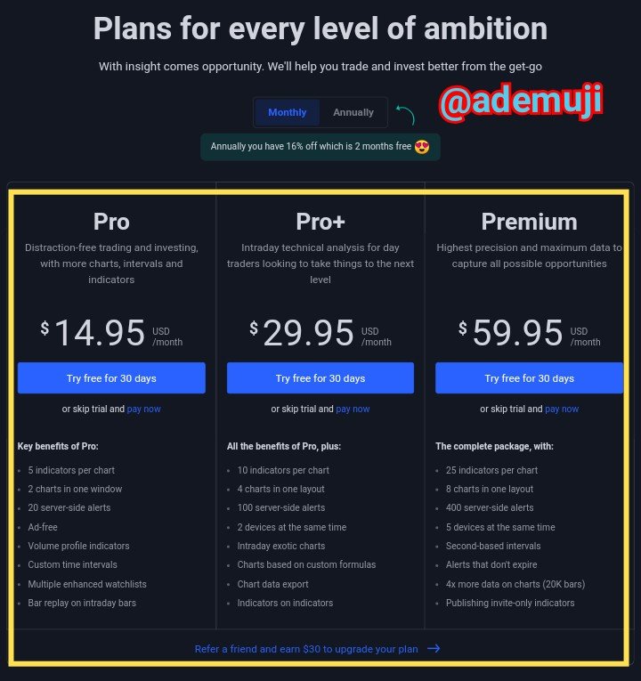 Tradingview provides traders/users with a variety of packages, which vary depending on the trader/user's experience and financial stability. To learn more about each package, go to the Tradingview website, and look for the Free Trail at the top of the main page. A new page will appear, with all of the packages offered, as well as their prices and features.