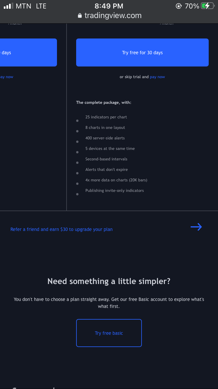 After clicking on Start Free Trial the packages available on the Trading View website will be displayed.