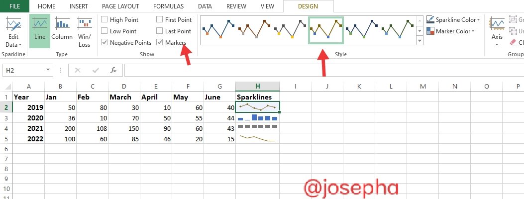 Step:1 Pick the sparkline you just made in any cell, then go to the design menu. Various checkboxes are visible to emphasize the data points.