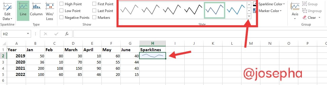 On a Sparkline, you may highlight the highest and lowest points as well as all of the data points. This will enable you to see the data trend more clearly. So let's get to see how we can do that.