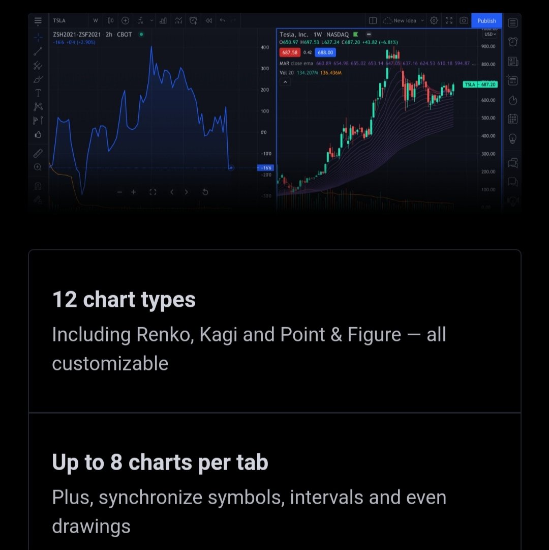 It provides 12 chart types, including Renko, Kagi and Point & Figure, all of which can be customized. In one tab can Up to 8 charts plus, synchronize symbols, intervals, and even images. We can also replay the market and view at the speed and resolution we want.