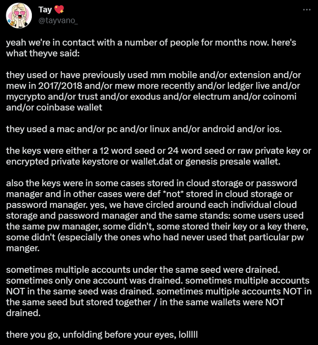 - There is no connections to the hacked wallets, no one knows how the seeds were compromised.