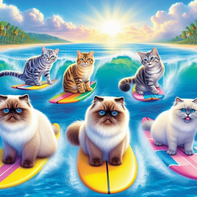 태평양의 푸른 파도 위, 수십 마리의 고양이가 서핑을 즐겼다. 🌊🐱