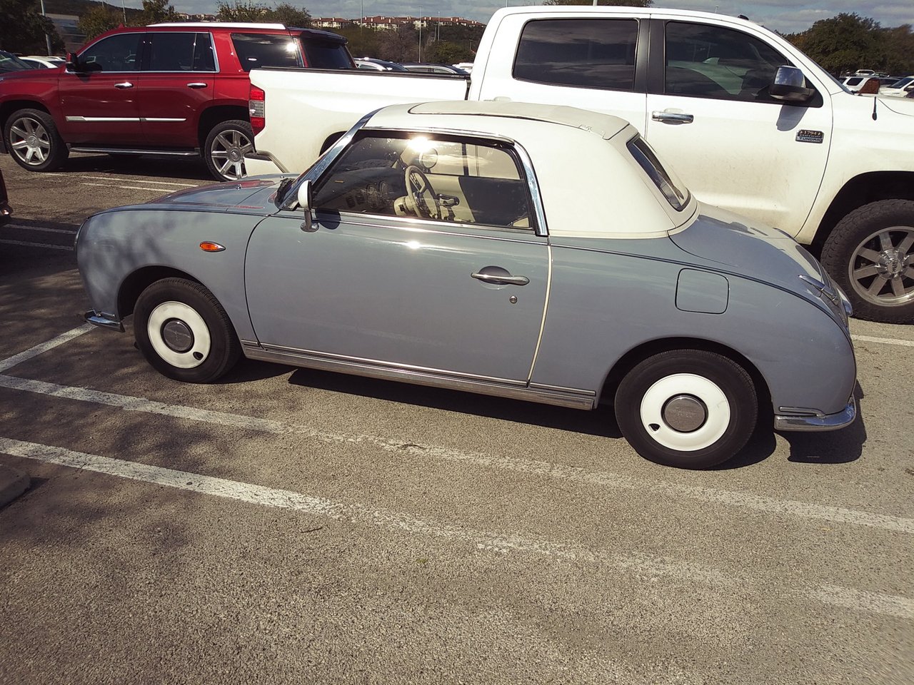 When we went to Perry's Steakhouse yesterday for my sisters' birthday lunch, we passed this cute little car while looking for a place to park. After lunch we saw that cute car still in the parking lot and I thought to myself, that would make a great Freewrite post, so I took some pictures. Since I had never seen this car before I had to Google it. It's a one year prototype, right hand drive, Nissan Figaro built in 1991. They produced only 20,073 units and they were all right hand drive. They only had four colors and they were all named after seasons. The cost was just shy of $17,000 new, and they are getting around $33,000 for low mileage vehicles selling on the internet. I couldn't find out why Nissan quit producing this cute little cars, but they seem to be very collectible.