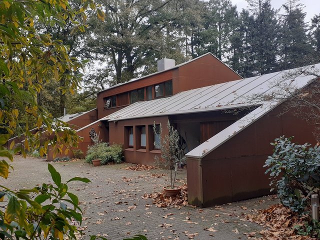 What I see: a bungalow and trees.
