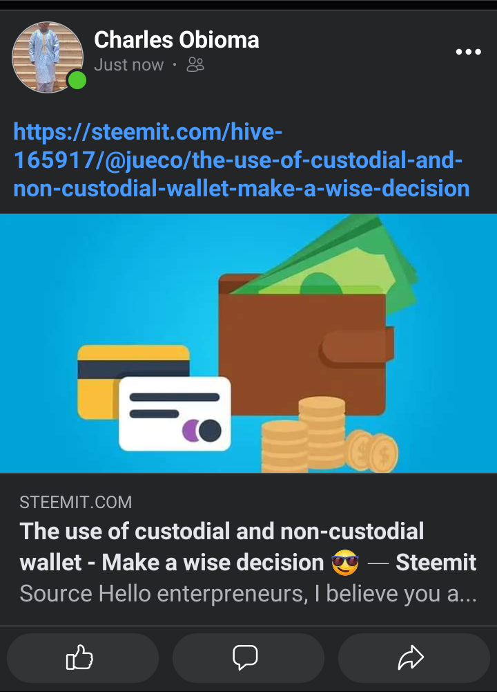 When I saw this, I decided to let it slide not until I fell victim to a centralized exchange that functions like a custodial wallet, and then I decided to let our entrepreneur know about custodial and non-custodial wallet, so they can make a right decision on which to use.