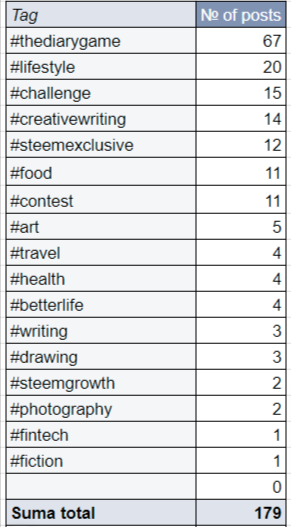 We did not just limit ourselves to the three tags (the diary game, food and creative writing) as indicated in our application post. We tried to cover different tags to reach out to more authors following the different content created by different authors and the chart below represents statistics of the various tags.