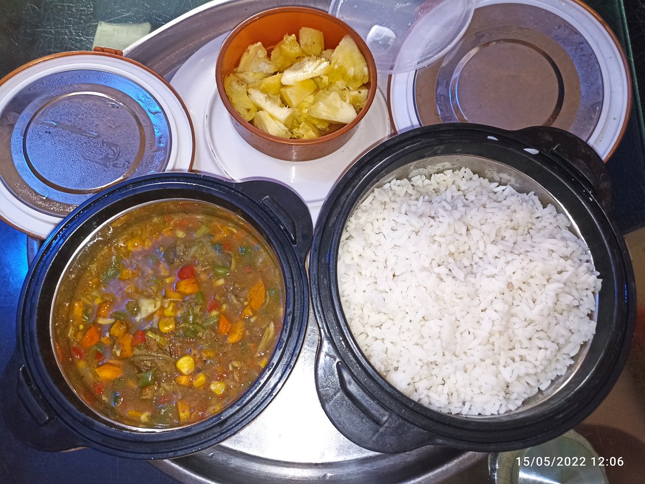 Enjoy this pot of goodness with boiled rice or Irish potatoes. For me I enjoyed it with rice and had some fruits (pine-apple).