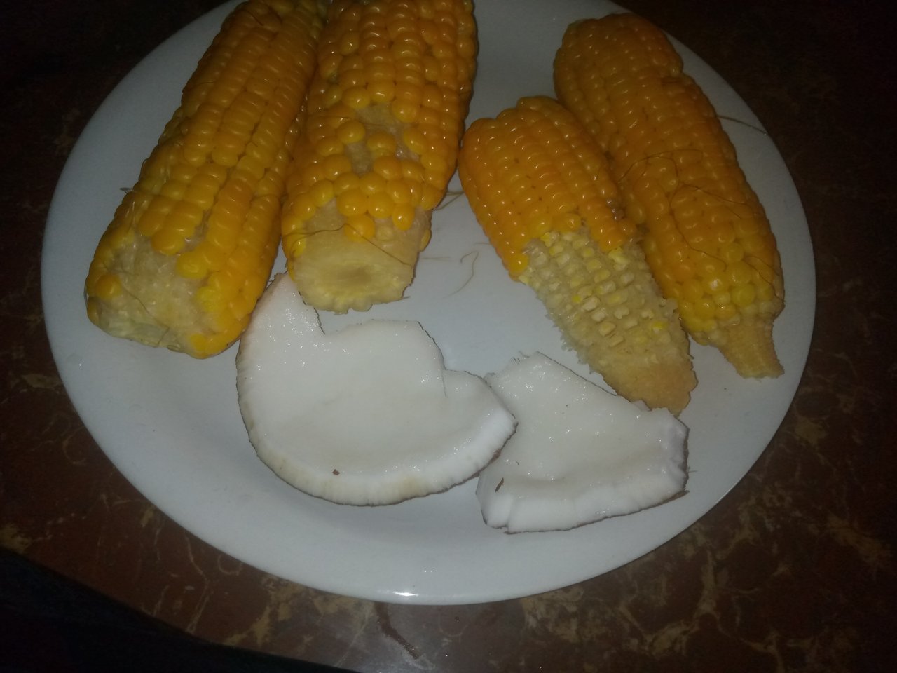 My baby and phone kept me busy till around 12:15 that I went out for my injection. When I went out I say a woman roasting corn; she's my customer. I priced some raw ones she displayed for sale. Her price was tight but I left her. My husband came back with same set if corn I priced....how he knew is miraculous. I cooked them and we enjoyed them with coconut when our children came back from school around 3:15...