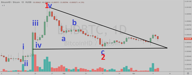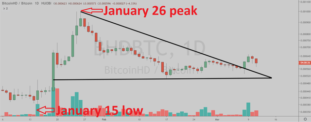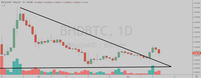 BitcoinHD (Huobi: BHDBTC) has broken out of the triangle pattern in the daily chart.