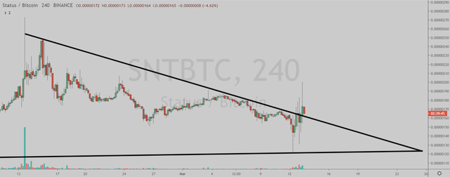 Status (Binance: SNTBTC) has broken out of the triangle pattern in the four-hour chart.