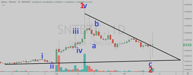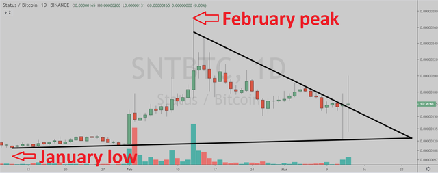 Status (Binance: SNTBTC) daily chart by Tradingview.