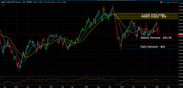 Oil is down three straight weeks, but this week it's down due to concern that the coronavirus in China will spread, hurting travel and fuel demand. However, I'm looking for the weekly demand to hold once gain.