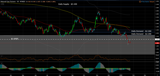 Prices continue to break down, breaching both daily demand zones and even the long standing 10 year support at the physiological whole round number of $2.000. The weather is expected to be warmer than normal for the next 6-10 and 8-14 days according to the last forecast, so expect prices to remain depressed.
