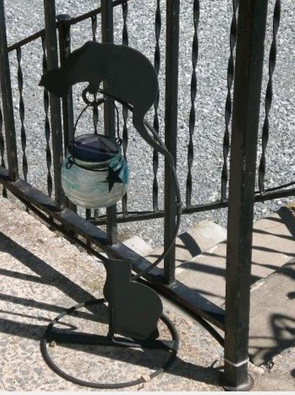 This heavy metal stand has the 2 key subjects that are Cat and Hanger. The stand is adorned with a cat on the top and a cat on the bottom of the stand. The top of the stand is the hanger for the blue tinted mason jar with solar lid. At night the jar emits a soft, blue light. My personal word is "Jar."