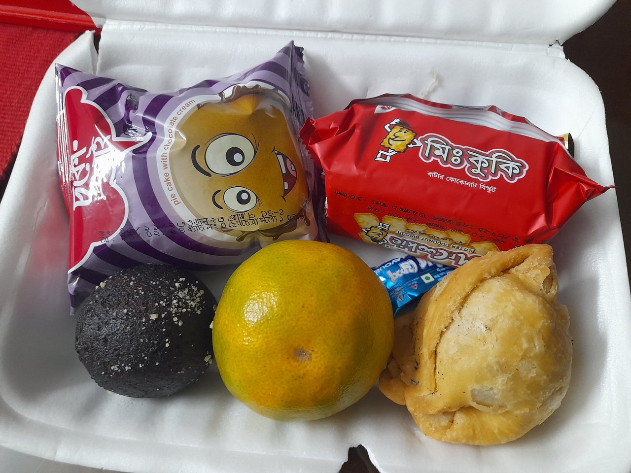 My nephew returned home after his coaching center program. He is given a crest and a food parcel. There were chocolates, biscuits, oranges, sweets, cakes in the food packet. I take pictures of his food.