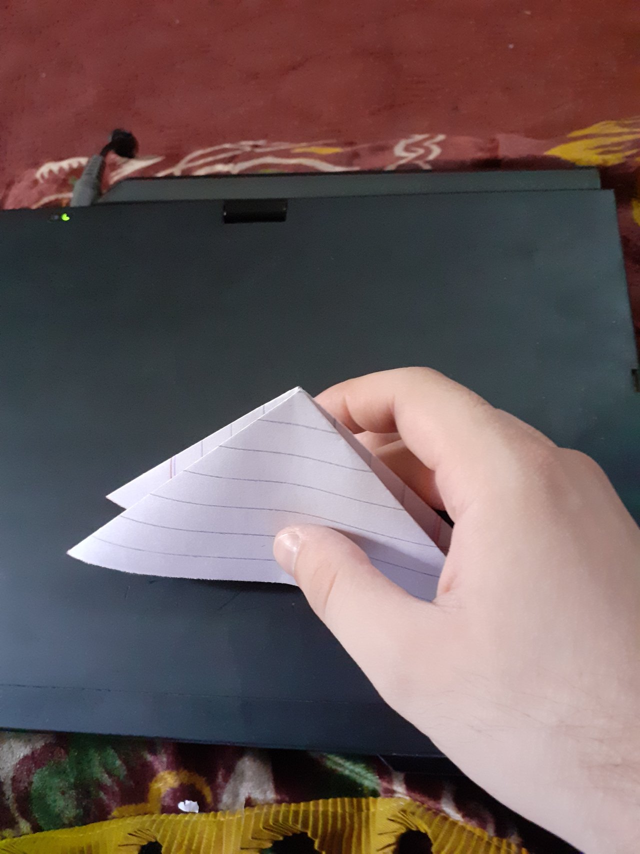- Fold it like this, the paper is folded into a triangle shape and then return to its original; 2 lines appears like a cross and the paper looks like a 2D pyramid.