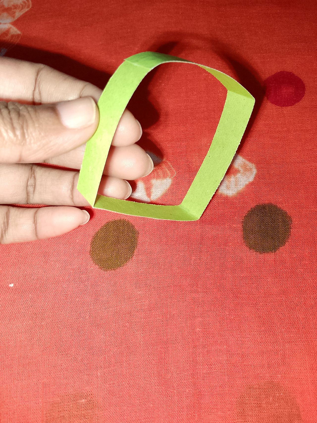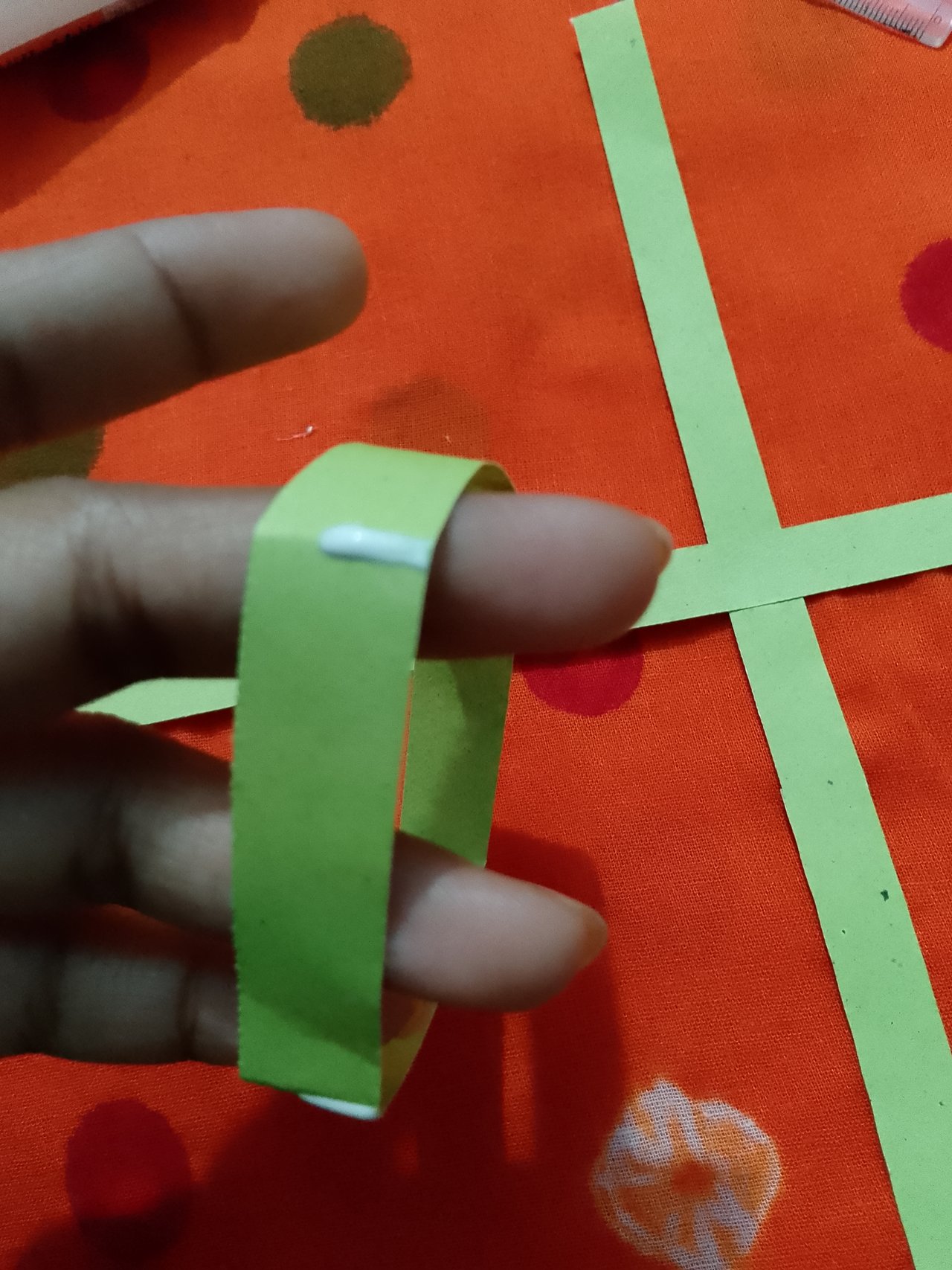 To make a paper basket, I first gathered all the necessary materials within reach. Then, I took a light green colored paper and used a cutter to cut it into ten equal paper pieces. Next, I took two pieces of paper. I applied glue to the center of one paper and adjusted the other paper over it. Then, I took another paper and shaped it like this.