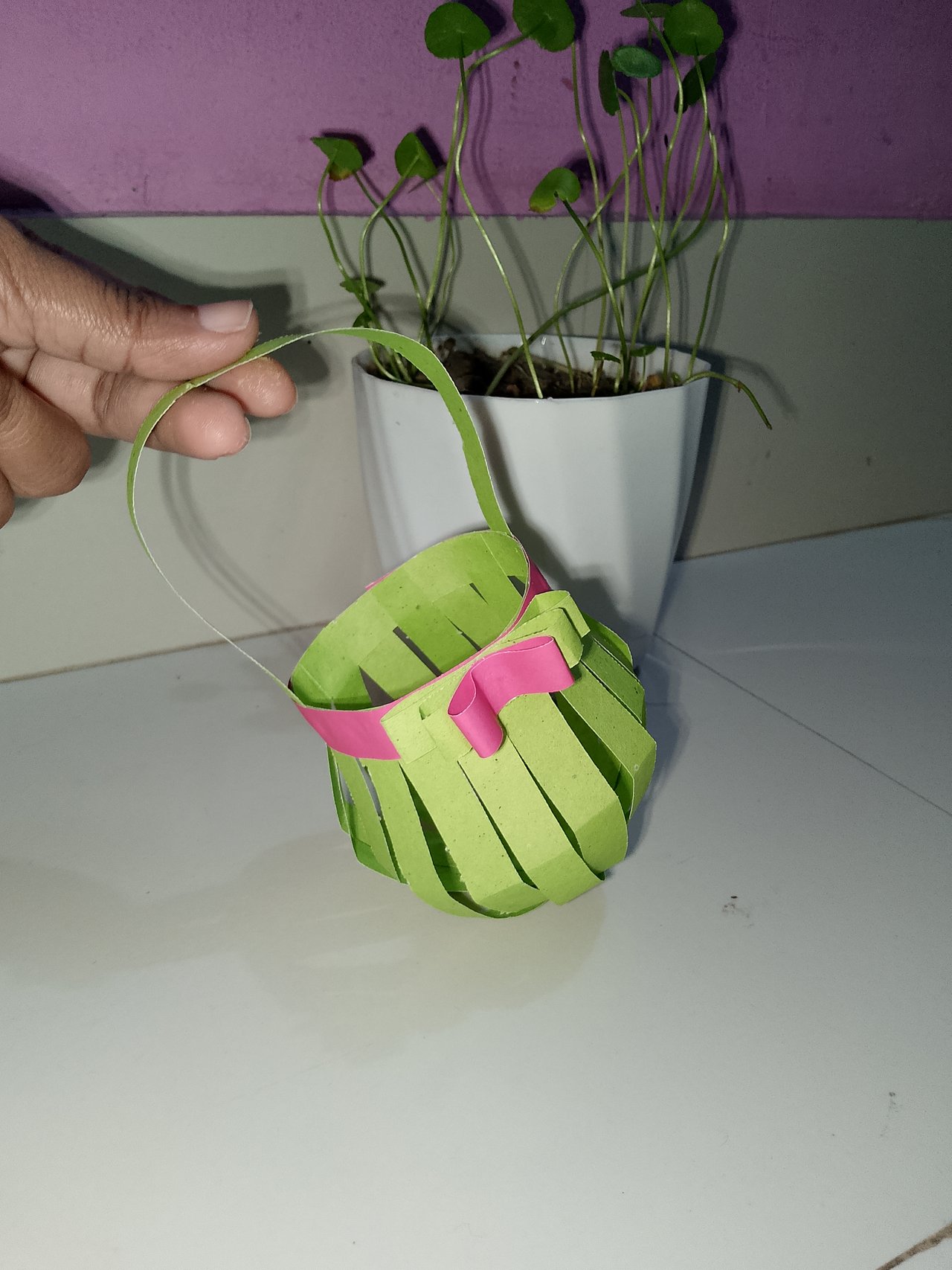 I took another piece of paper and glued it to the basket in this manner. This became a handle for the basket, which allows us to carry it easily.