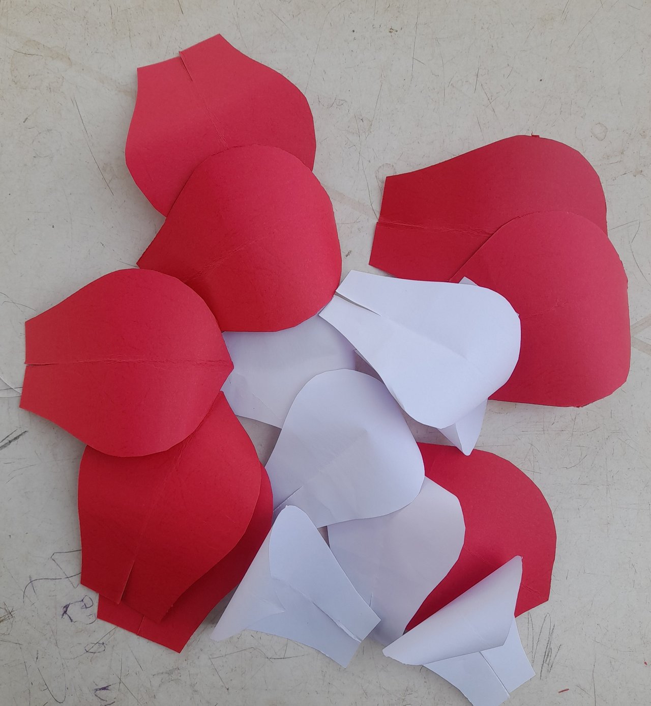 I cut the base of the flower which is octagon in shape because my flower shall have eight (8) petals. After cutting the base for the red and white, I started gumming the petals one by one on both the red and white bases.