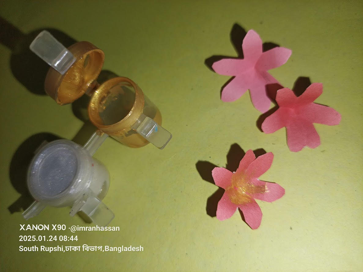 Then when the paper was cut into flowers, I cut them lightly on one side and made them into a round shape like a flower. Then I painted the middle of the flower with a brush.