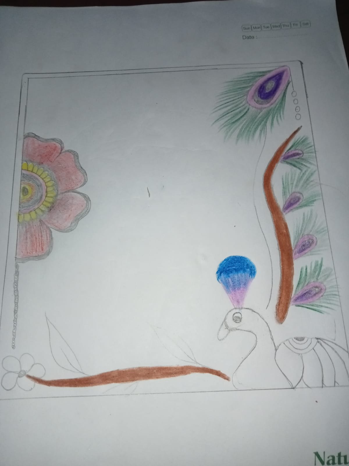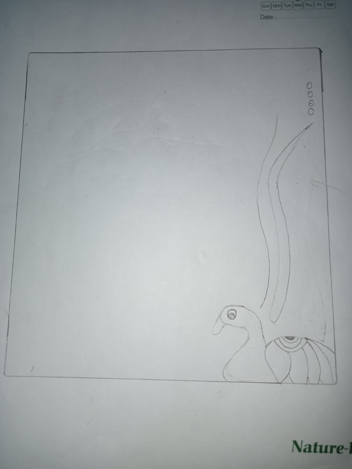 In this stage, I began drawing on the notebook's right side. I sketched the feathers and the top of the peacock's head.