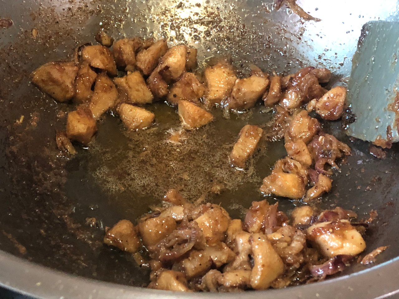 In the third step I'll turn on the gas tub stove and heat the oil in a pan and then boil the onion in it. Onion raw I will pour all the marinated chicken and cook the chicken with oil and onion for a while I will not give any extra water, the water that comes out of this chicken will boil the chicken.