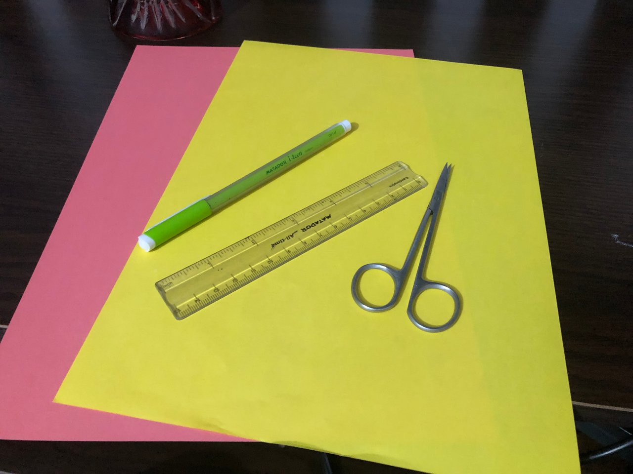 I need two colors of paper, a scissor, a ruler, a pencil and glue to make a birthday wish card.