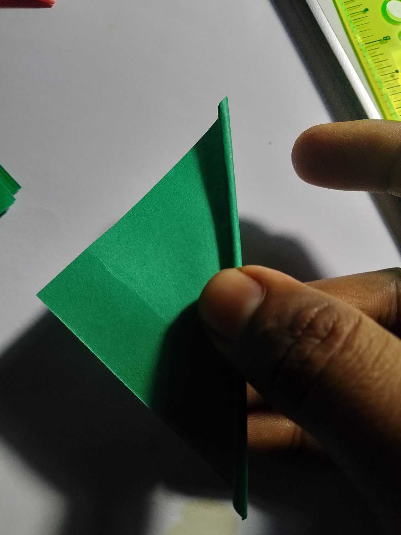 To make this beautiful flower, first take two pieces of colored paper. Then cut the colored paper into a specific size.Cut into pieces.Cut the red paper into 4:3:4:3 proportions.Cut the green paper into two sizes. One size is 7:5:7:3. The other size is 7:3:6:3.
