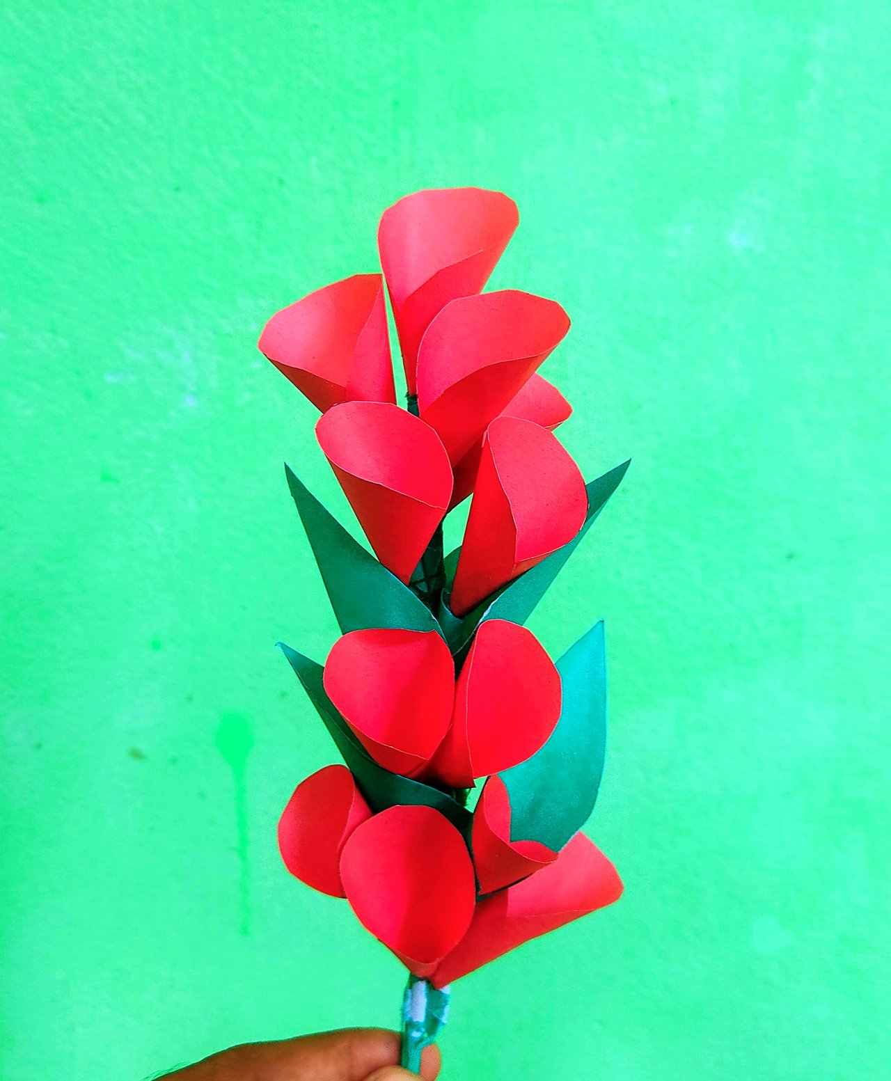 After that, the flowers and the data of the flowers that I glued together, I tied them together beautifully with yarn and glued them together. Then I glued the leaves that I had made to it nicely. This is how I beautifully made a bunch of my paper flowers.